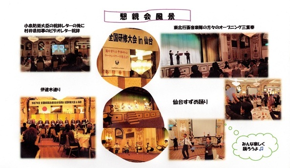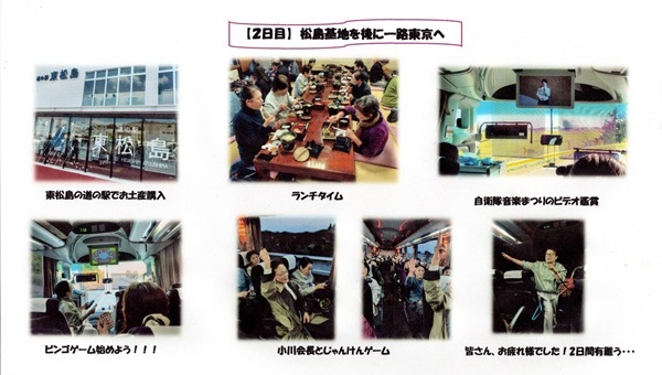 | 11月11日、女性部会は小川女性部会長はじめ40名で1泊2日の研修旅行を実施した。 1日目は仙台の格調高いレトロなホテルに1泊し、松島基地司令のユーモア溢れる講話と伊達藩末裔の興味深い歴史を聴講し、その後は全国女性部会員と東北管内自衛隊VIPを含む約250名の盛大な懇親会に参加。 2日目は松島基地を訪問し殉職隊員に献花、ブルーインパルスの隊員との交流等基地内見学、往復の車中では「頭の体操クイズ」、ビンゴゲームなど趣向を凝らし、全員が一つになって盛り上がり有意義な旅であった。 |