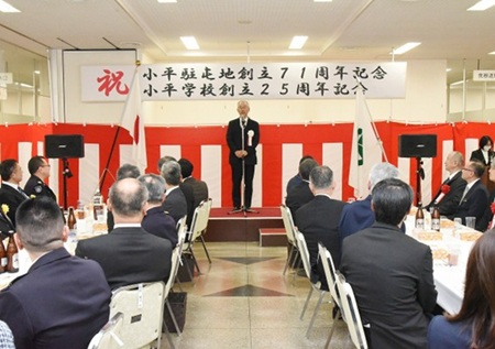 ![]() 小平駐屯地創立64周年及び小平学校創立17周年記念式典風景 ![]() 祝賀会 永田政弘会長による乾杯の音頭 |