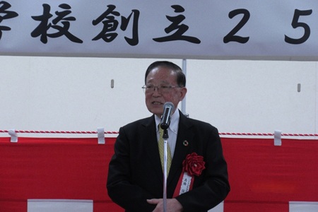 | 壇上の来賓者として、10月4日に日本において、女性として初の総理大臣に選出された高市早苗内閣の下で文部科学大臣に就任された松本洋平衆議院議員を筆頭に、塩入清香参議院議員、木原誠二議員、末松義則両衆議院議員(共に代理)をはじめ小林洋子小平市長、松岡あつし・竹井ようこ両都議会議員(他の公務のため欠席)が紹介された後、松本大臣が祝辞を述べられました。その後、壇上の多くの来賓が紹介された後、各方面から寄せられた祝電の披露がありました。そして10時40分に国旗退出、執行者降壇によって記念式典は無事に終了しました。 |