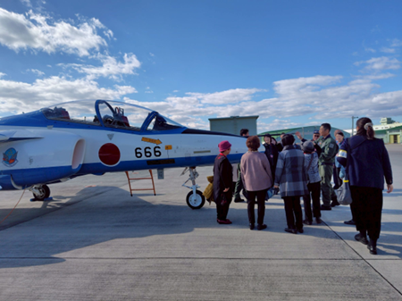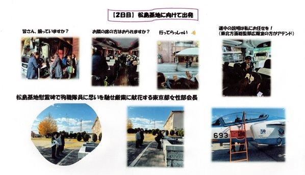 | 11月11日、女性部会は小川女性部会長はじめ40名で1泊2日の研修旅行を実施した。 1日目は仙台の格調高いレトロなホテルに1泊し、松島基地司令のユーモア溢れる講話と伊達藩末裔の興味深い歴史を聴講し、その後は全国女性部会員と東北管内自衛隊VIPを含む約250名の盛大な懇親会に参加。 2日目は松島基地を訪問し殉職隊員に献花、ブルーインパルスの隊員との交流等基地内見学、往復の車中では「頭の体操クイズ」、ビンゴゲームなど趣向を凝らし、全員が一つになって盛り上がり有意義な旅であった。 |