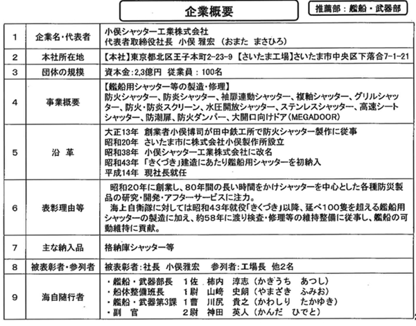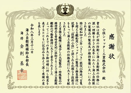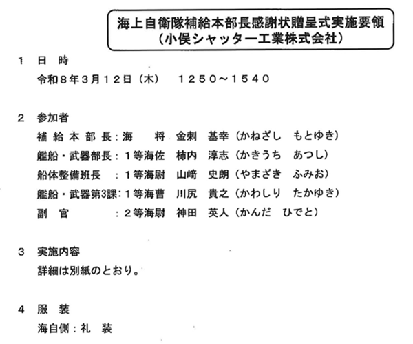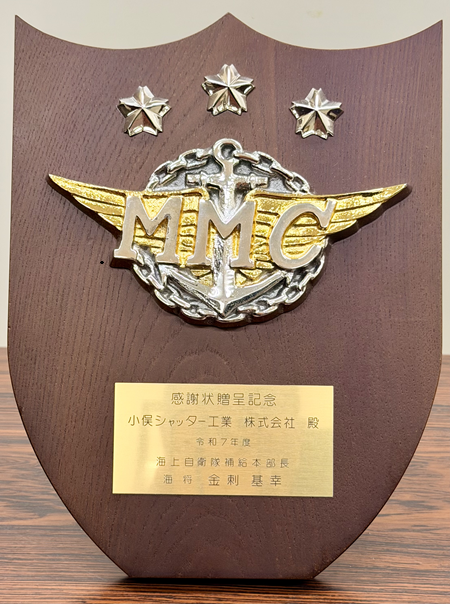 | 令和8年3月12日 、北区防衛協会 小俣会長の会社である小俣シャッター工業梶uさいたま工場」において、海上自衛隊補給本部金刺本部長より感謝状を受賞した。 |