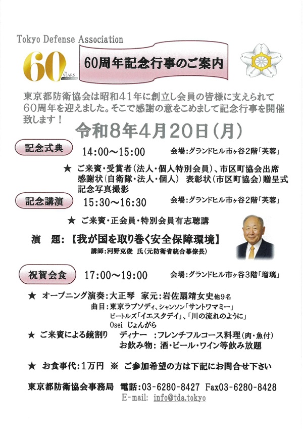 | 東京都防衛協会は令和8年4月20日(月)ホテルグランドヒル市ヶ谷において創立60周年記念行事を開催します。 **** 会員の皆様のご参加をお待ちしています **** |